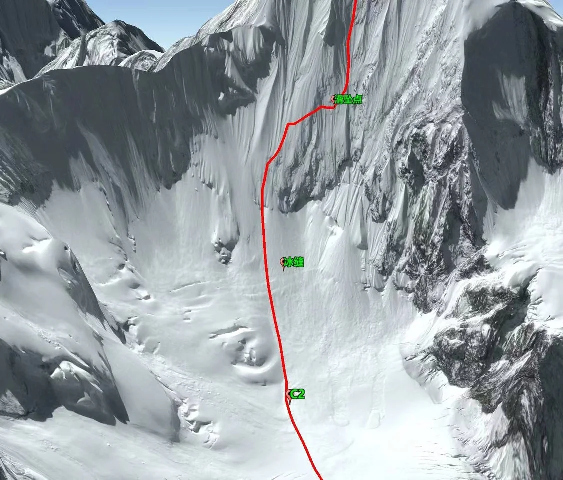朱鹏介绍,两人一边设置保护站一边下撤,两人之间的绳距约50米,下撤八九段绳距后,降至海拔约5600米的高度。(注:保护站,指通过设置锚点和连接装备,为攀登者提供安全保障的系统性操作)