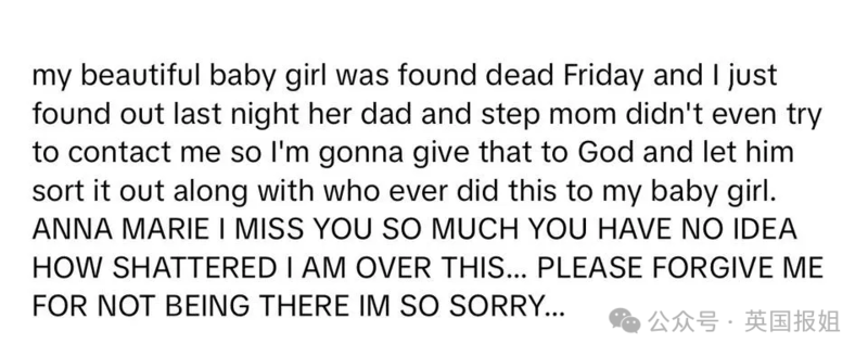 “我美丽的宝贝女儿在周五被发现死亡,而我昨晚才得知这件事。她的父亲和继母甚至没有试图联系我,所以我只能把这一切交给上帝,让他去处理,包括对我宝贝女儿做下这种事的人。