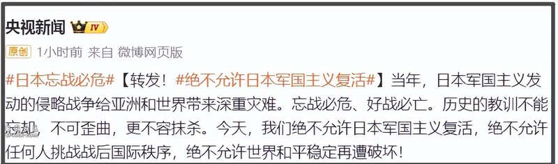 央视新闻发文称要时刻牢记“忘战必危,好战必亡”,不允许任何人挑战战后国际秩序及和平。随后,众多明星纷纷转发。