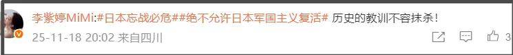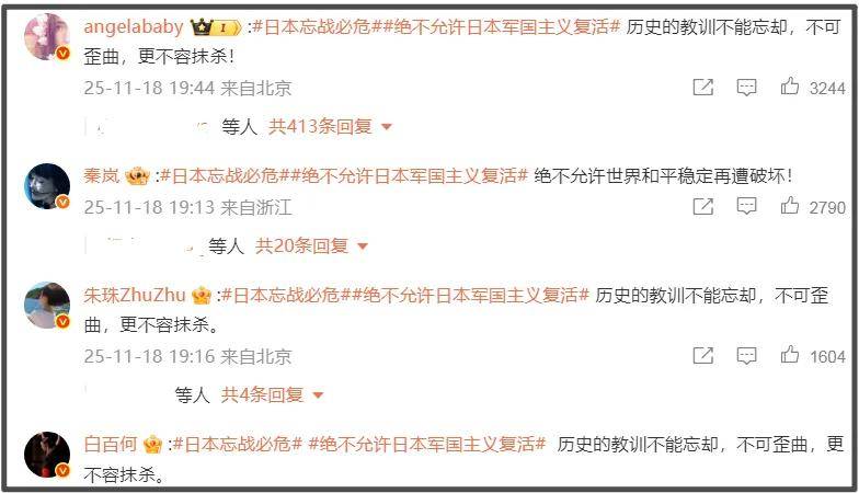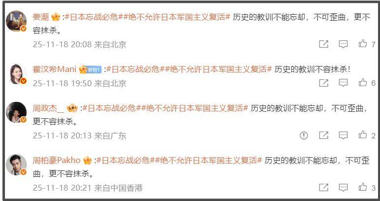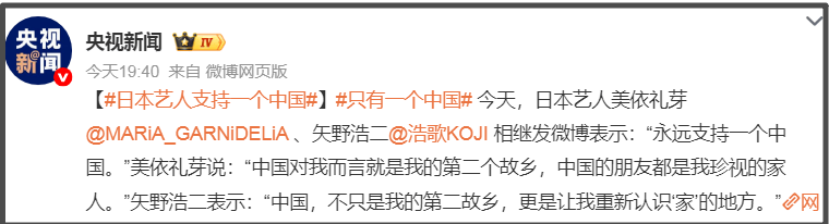 而泰籍华裔(专题)李紫婷也坚决表示不允许日本军国主义复活,历史的教训不容抹杀。此外,美依礼芽、矢野浩二表态坚持一个中国原则也得到央视新闻的点赞,可见中国对立场正确的日本艺人持欢迎态度。