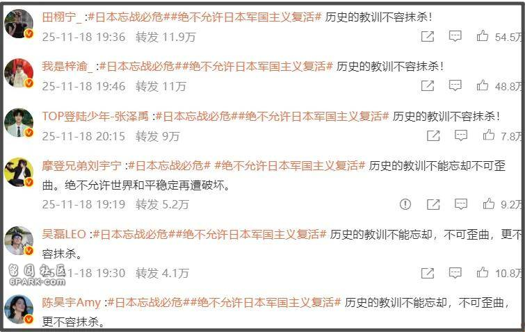 浏览转发区,大约有近两百位艺人参与转发,都表示历史的教训不容抹杀,督促日本忘战必危。转发量较大有肖战、吴磊、田栩宁等新生代,像陈昊宇、刘宇宁等等也都在热门转发区,而如黄晓明、杜江等艺人的转发就靠后。总的来说除了一线艺人转发外,二三线及短剧的演员也加入其中,可以看出此次形势非常关键。