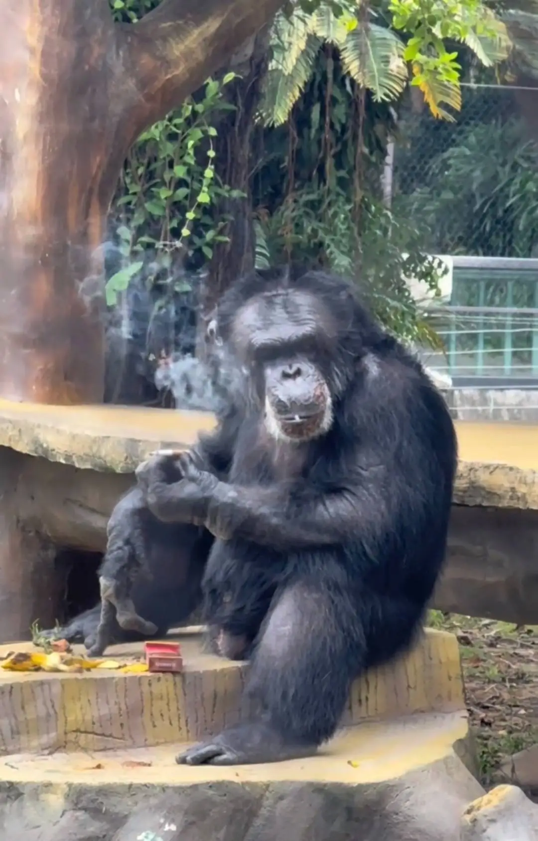 南宁动物园工作人员向封面新闻回应此事时,确认该园的一只黑猩猩有模仿人类抽烟的现象。