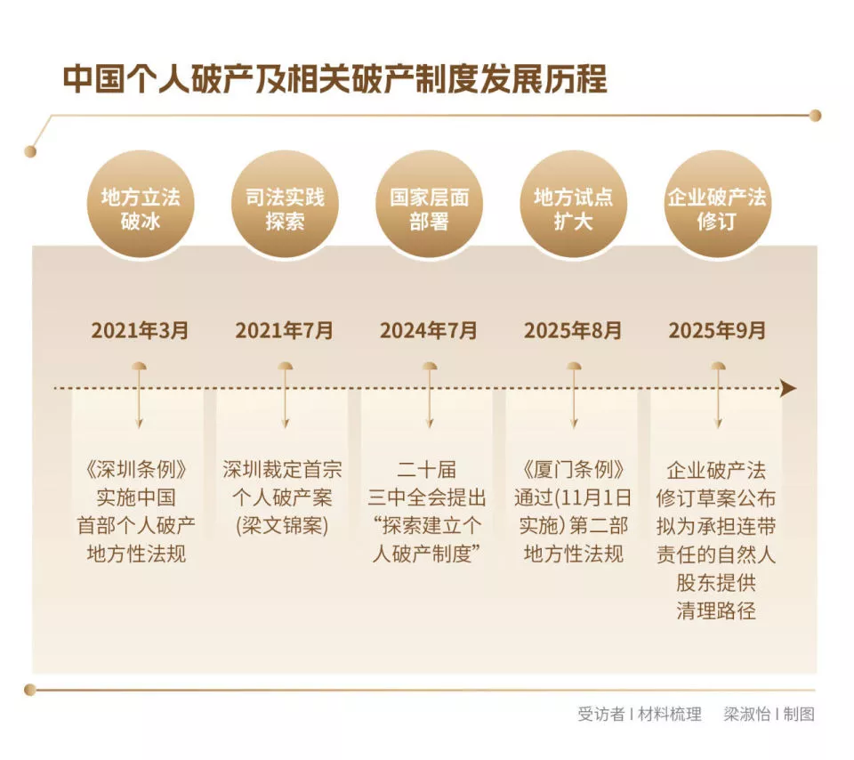最高人民法院2017年就开始支持地方法院进行个人债务集中清理探索的司法实践。《深圳条例》2021年3月施行,至2025年10月已受理个人破产申请709件,化解债务2.21亿余元,六百多个家庭得以解除债务枷锁。《厦门条例》11月起施行。
