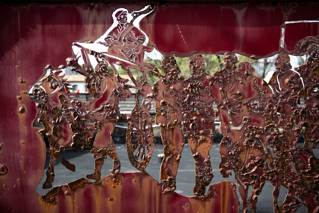 大寨铁栅栏上锈迹斑斑的宣传画。