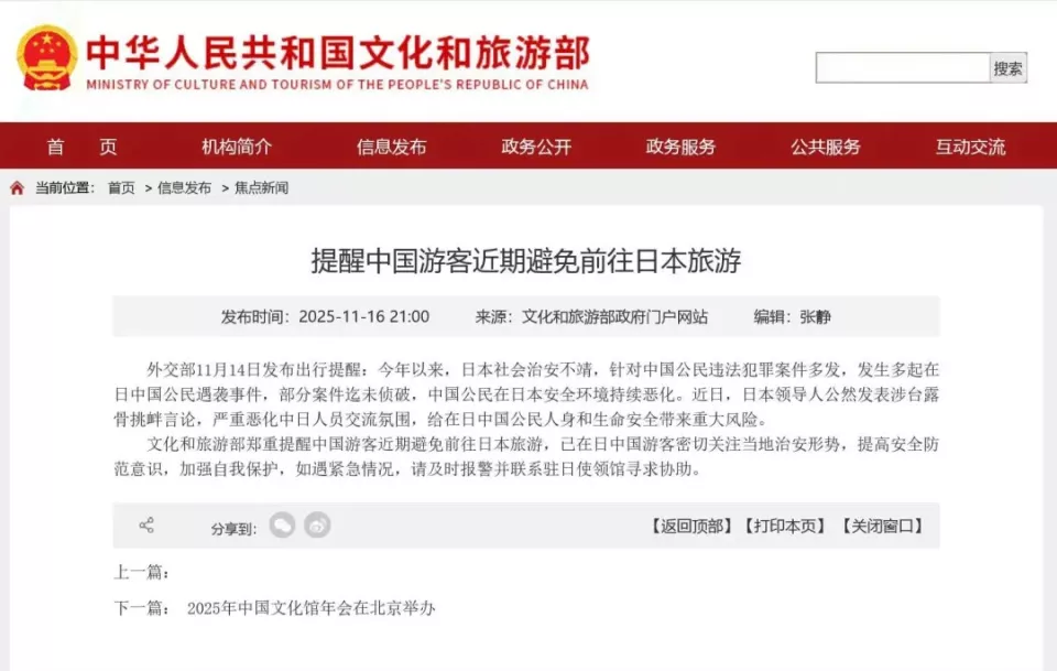 随后,文旅部发布赴日旅游安全提醒,教育部同步发布留学预警,劝阻中国游客赴日。此举将重创依赖中国游客的日本旅游业。