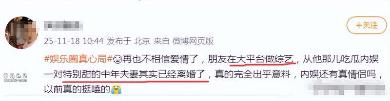 知情人爆料11月18日,网上有人透露“一对中年甜蜜夫妻已经离婚”的消息,引发吃瓜网友关注。