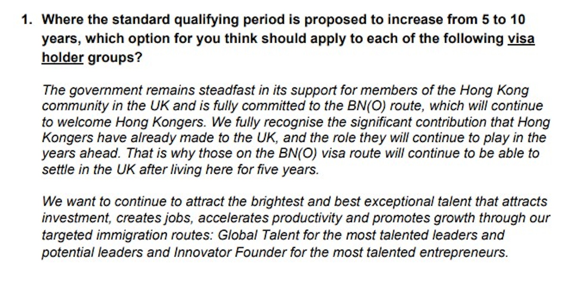 英国政府在文件谈到,一贯坚定支持在英的香港(专题)社群成员,全力支持英国国民(海外)签证途径,继续欢迎香港居民,认可香港居民过去对英国的贡献以及他们未来将继续发挥的作用。因此持有英国国民(海外)签证的人士在英国居住满5年后,可申请永久居留权。