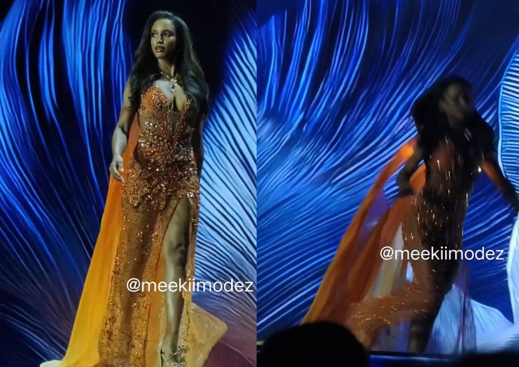 泰国曼谷举办的环球小姐竞赛中,代表牙买加的佳丽加布里埃尔·亨利(Gabrielle Henry)在预赛的晚礼服展示环节发生了意外,她不慎从舞台边缘跌落,随后被医护人员用担架抬出场地,并紧急送往医院接受治疗。根据社群媒体上流传的影像资料显示,这位选美代表当时身穿一件亮眼的橙色礼服,正在T台上自信地走秀,然而不幸的是,她突然踩空,从光线较暗的舞台边缘摔落,面部朝下直接摔倒在地。