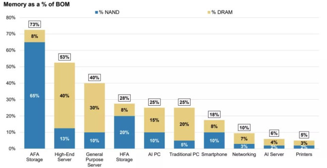 下图是大摩统计的“内存在硬件厂商成本中的占比”,其中All-Flash Array Storage(全闪存阵列存储)位居首位,占比73%。
