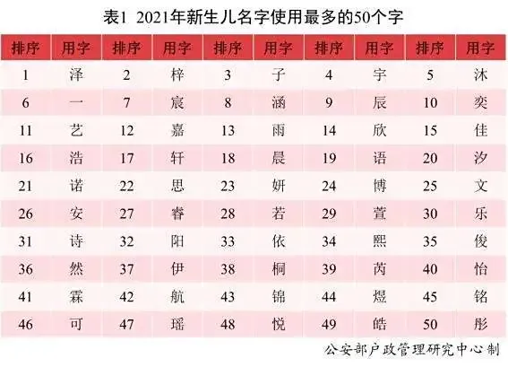 报告还指出,2021年新生儿名字中使用频率最高的50个字是“泽、梓、子、宇、沐”等。