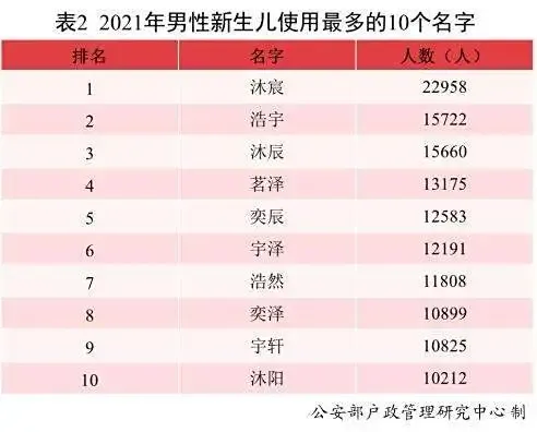 根据2022年1月公安部发布的《二〇二一年全国姓名报告》,2021年已登记的男性新生儿中,使用频率最高的名字依次为:沐宸、浩宇、沐辰、茗泽、奕辰等,其中“沐宸”使用人数达2.3万,登顶榜首。