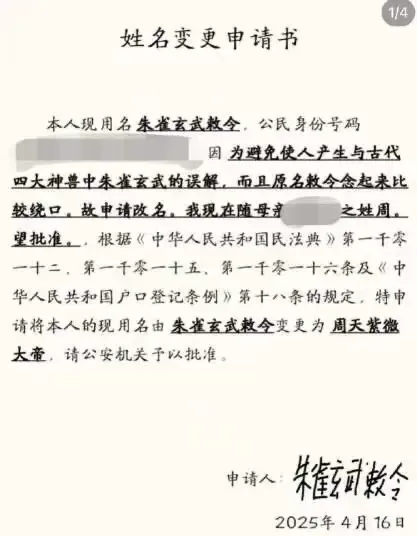 还有湖南一个00后,先叫朱雀玄武,后来改为“朱雀玄武敕令”,现在又因觉得该名字易引发误解且拗口,申请随母姓并更名为“周天紫微大帝”!