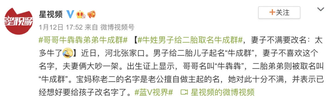 男子给双胞胎哥哥叫“牛犇犇,二胎弟弟则被取名叫“牛成群”,终于导致妻子非常不满:太多牛了,老二的名字必须改!
