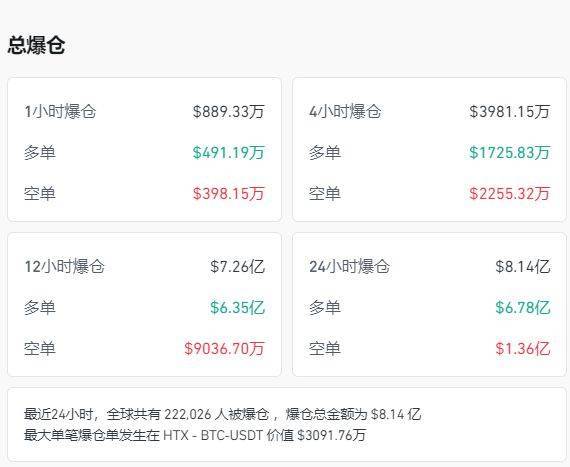 Coinglass数据显示,加密货币全网24小时超22万人爆仓,8.14亿美元(约合人民币(专题)58亿元)灰飞烟灭。