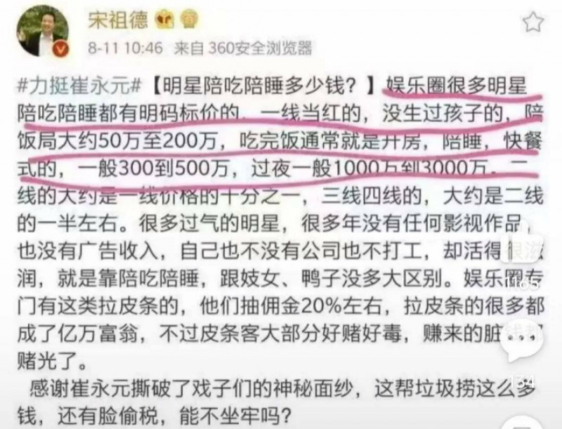先前,娱乐评论人,也是于朦胧的恩师宋祖德就曾在微博爆料中国娱乐圈的乱象,以“明星陪吃陪睡多少钱?”为题揭露明码标价的内幕。