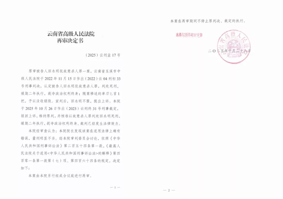 2022年11月,云南省玉溪中院一审宣判,田永明犯故意杀人罪,被判处死刑,缓期二年执行,玉溪市人民检察院并未抗诉。田永明不服,提出上诉。