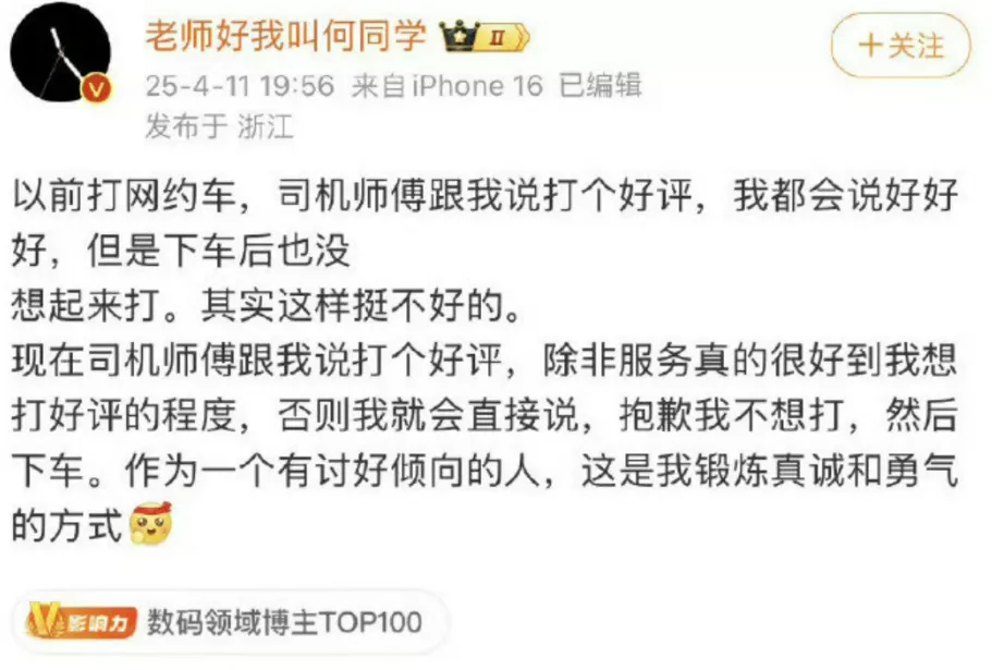 今年 4 月,何同学在微博发了一篇小短文,本意是想跟大家分享自己“心态有进步”。何同学表示,他以前打网约车遇上司机主动提出求好评,他会嘴上答应但下车就忘,觉得这样挺不好的。现在为了克服“讨好型人格”,除非网约车司机服务好到让他主动想打好评,否则会直接说自己不想给。