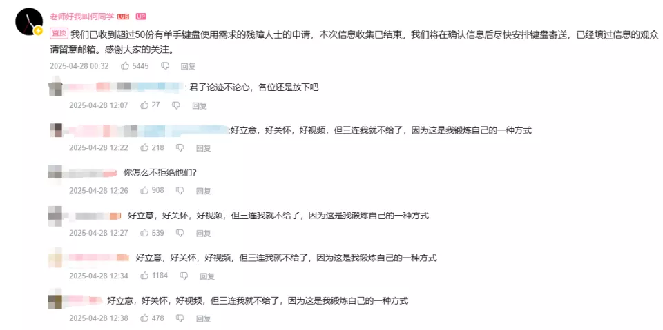 这里有个小插曲。何同学当时删博之后沉寂了一段时间,4 月底的时候悄悄恢复了更新。我看了那期内容,是给一个残障女孩做了一款单手也能用的键盘。抛开所有的东西不谈,内容是很有意义的。而且这个视频里,没有出现何同学呼吁大家一键三连的画面。