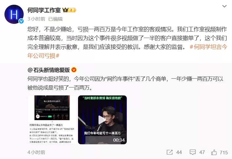 没过多久,何同学悄悄删了微博,没有做任何公开回应。直到七个月后的今天,他才在访谈中坦言今年公司亏了一两百万,核心原因就是这条微博带来的负面影响。