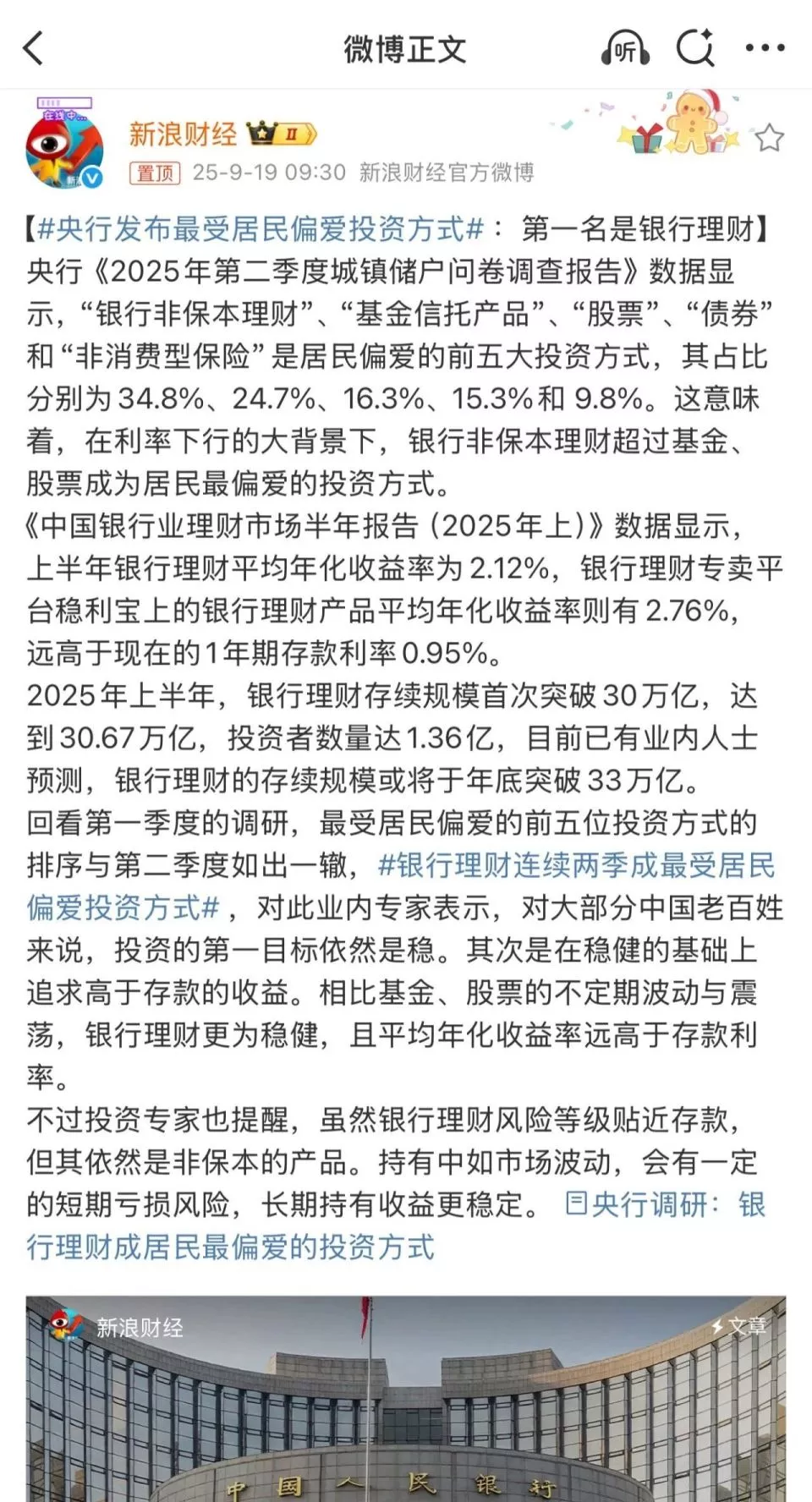 三季度城镇储户问卷更直接点明了市场偏好:仅18.5%的居民倾向增加投资,而在具体投资品选择上,“求稳”成为绝对主流——银行理财以36%的占比稳居首位,受欢迎度是股票(17.2%)的两倍多,基金则以26.4%位列第二。而像许心月母亲这样的稳健型投资者,仍是市场的绝对主力。