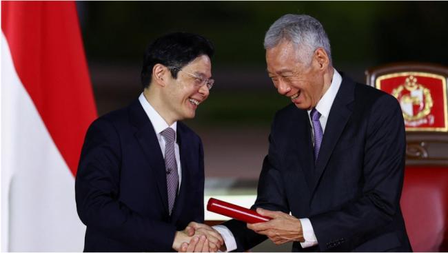 图为2024年5月15日,新加坡副总理兼财政部长黄循财在新加坡总统府宣誓就任新加坡第四任总理,并与行将卸任的现任总理李显龙握手。(REUTERS/Edgar Su/Pool)