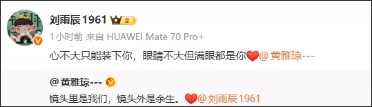 随后,刘雨辰转发回应:“心不大只能装下你,眼睛不大但满眼都是你。”黄雅琼则回复称:“说得很真实。”