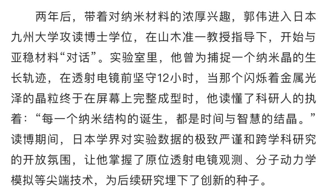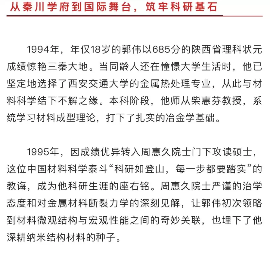 接下来,绘声绘色的报道了郭伟的开挂之路,说他是当年的理科状元,考入西安交大,之后师从院士学习材料科学。
