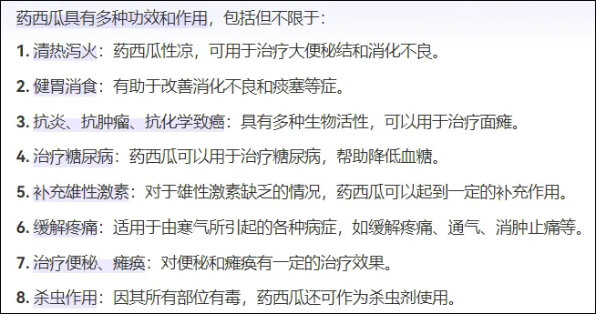 据科学检测,药西瓜内含4种皂苷类化合物、3种铁类化合物和2种生物碱类化合物。