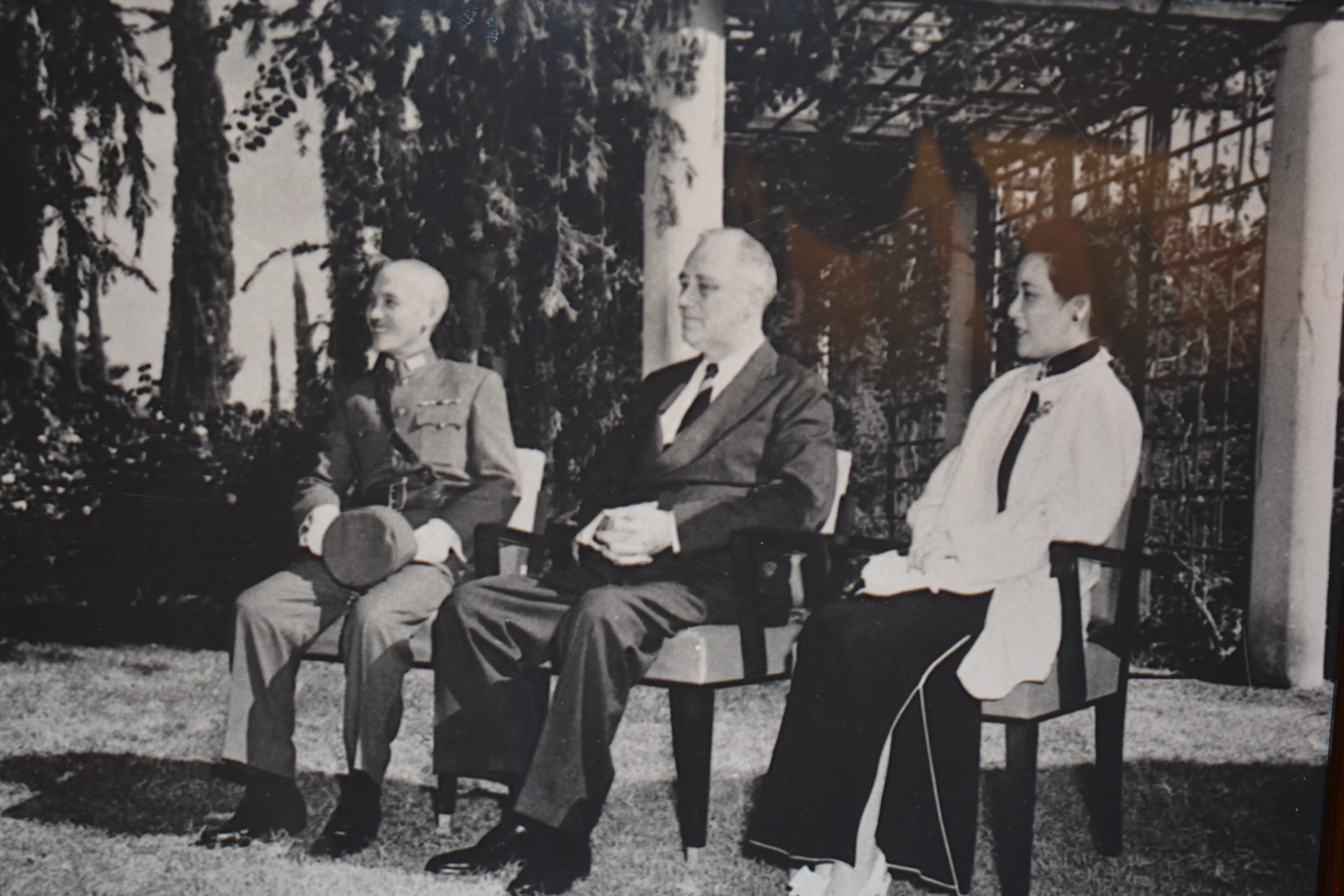 蒋中正夫妇与罗斯福在开罗会议中合影,从中可以证实中国在美国总统心目中有多重要的地位。(拍摄自国史馆开罗宣言70周年纪念特展)