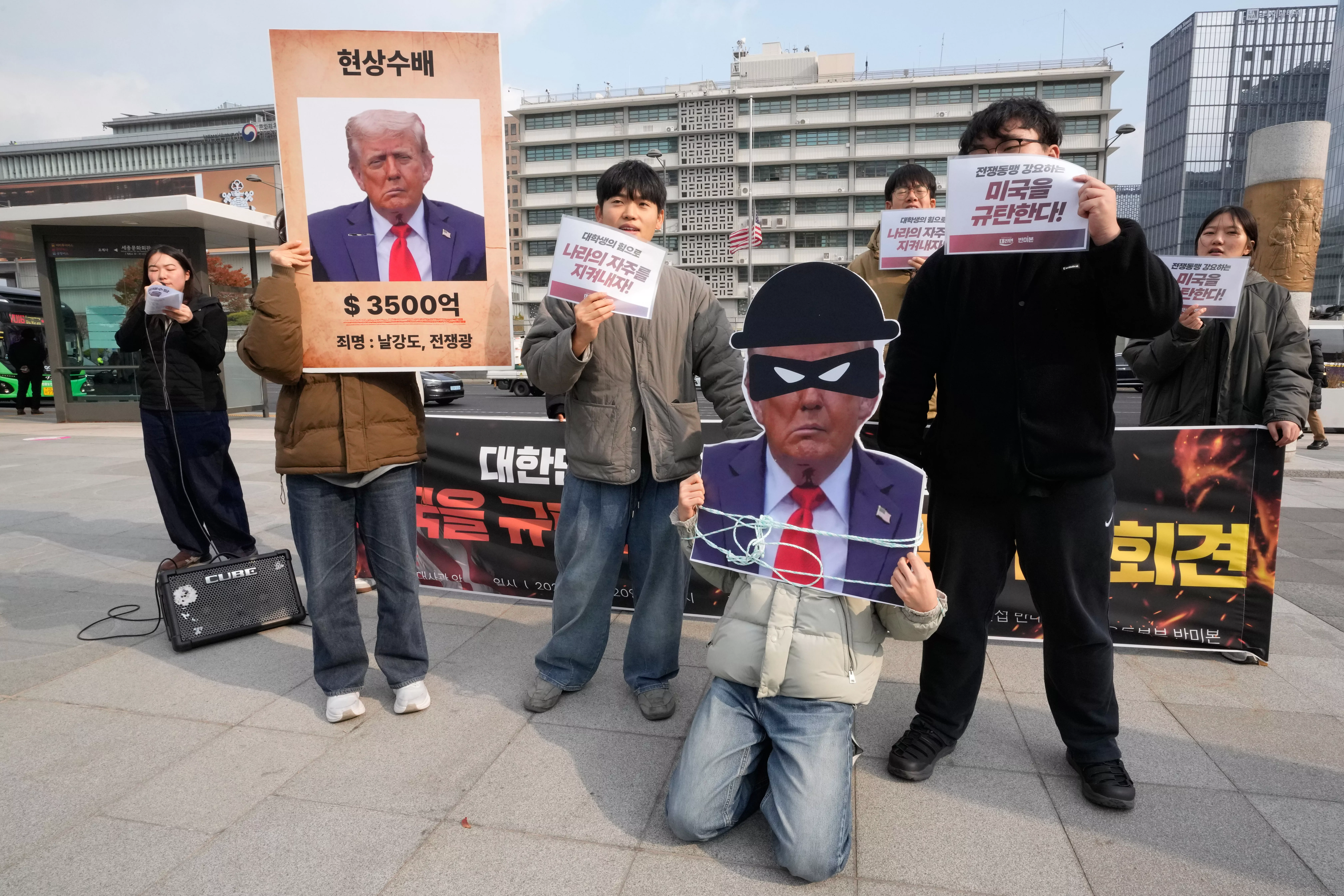 南韩总统李在明14日曾亲自宣布,敲定与美国的贸易协议,南韩以3500亿美元对美投资,作为换取美国总统川普降低关税税率的条件。为此,部分偏激的左派(进步派)与农民团体,今(22)日下午聚集在首尔市中心,抗议川普的「巧取豪夺」。