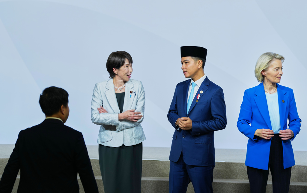 日本首相高市早苗昨天在G20峰会与印尼副总统吉伯朗交谈。(美联社)