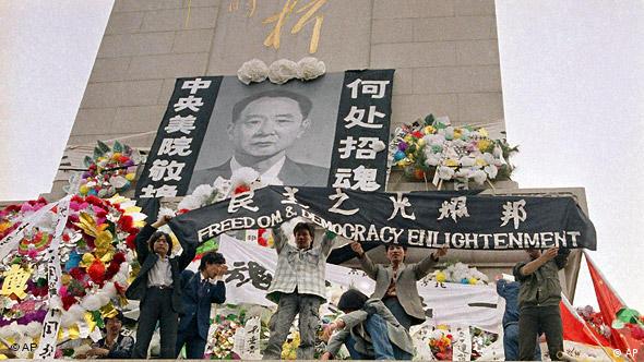 1989年4月,学生们聚集在北京天安门广场的民族英雄纪念碑前悼念前中共总书记胡耀邦图像来源: AP
