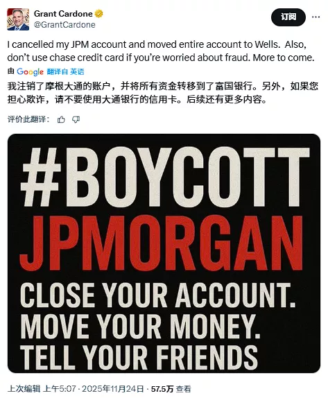 据华尔街见闻文章,房地产投资者、比特币倡导者Grant Cardone在社交媒体上表示:"我刚从大通银行撤出2000万美元,并因信用卡不当行为起诉他们。"比特币倡导者Max Keiser则喊话:"击垮摩根大通,买入MicroStrategy和比特币。"