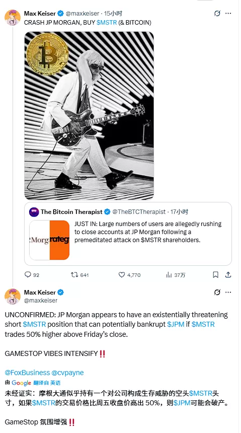 这场网络抵制运动迅速发酵,据报告显示,大量用户正涌向摩根大通要求关闭账户。更有甚者,币圈开始流传摩根大通对MSTR持有"存在威胁性的巨额空头头寸"的传言,声称如果MSTR股价较上周五收盘价上涨50%,可能导致摩根大通破产。