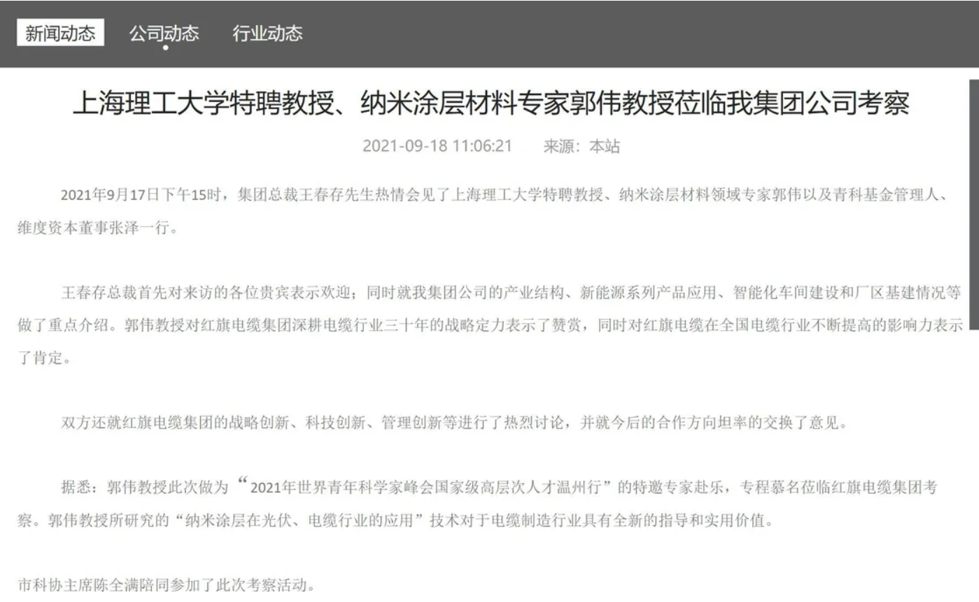 然而,这场见面并非该公司主动邀请。文章中还有这样一段话:郭伟教授此次作为“2021年世界青年科学家峰会国家级高层次人才温州行”的特邀专家,专程慕名莅临红旗电缆集团考察。文章还提到,“郭伟教授所研究的‘纳米涂层在光伏、电缆行业的应用’技术对于电缆制造行业具有全新的指导和实用价值”。