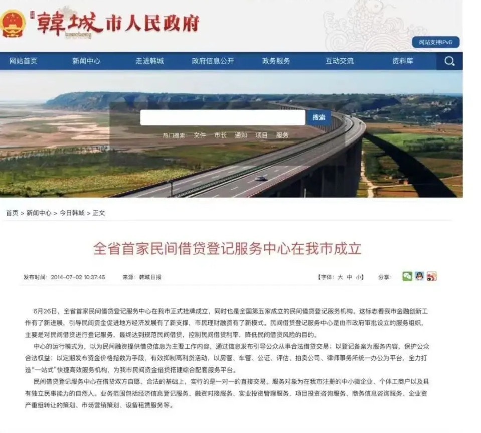 公开资料显示,该中心成立于2014年6月,是经韩城市政府批准的陝西省首家民间借贷服务机构,从设立之初就带有明确的政策使命,被定位为「规范民间融资、支持中小微企业」的金融创新平台,官方媒体则将其誉为「为閒散资金找到安全投资管道」的金融创新典范。