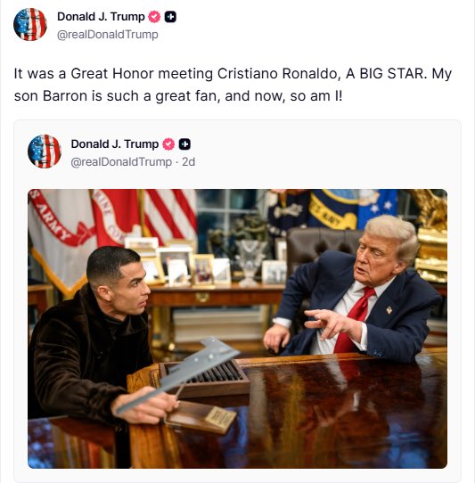在晚宴中,特朗普也的确给足了C罗面子,他在致辞中表示:“我儿子是C罗的超级粉丝,今天他们相见了,我觉得我儿子现在对他的父亲更加尊敬了。”
