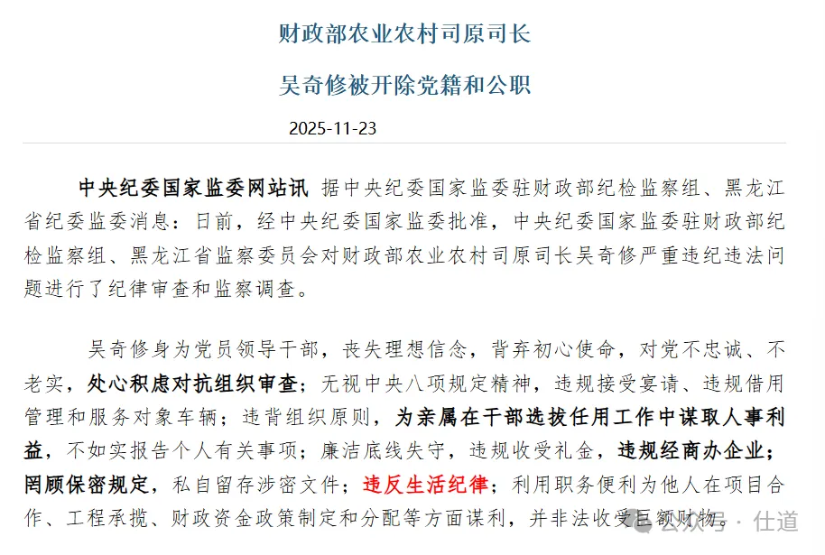 从2010年底进入财政部,到2025年4月在财政部农业农村司司长任上落马,15年时间悄然流逝,吴奇修一直未能再上台阶,始终是一名正厅级干部。