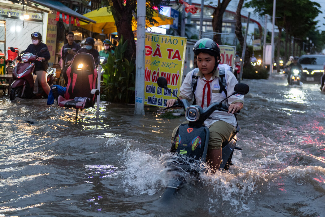 本月早些时候,一辆摩托车在胡志明市被洪水淹没的街道上疾驰而过。 THANH HUE/GETTY IMAGES