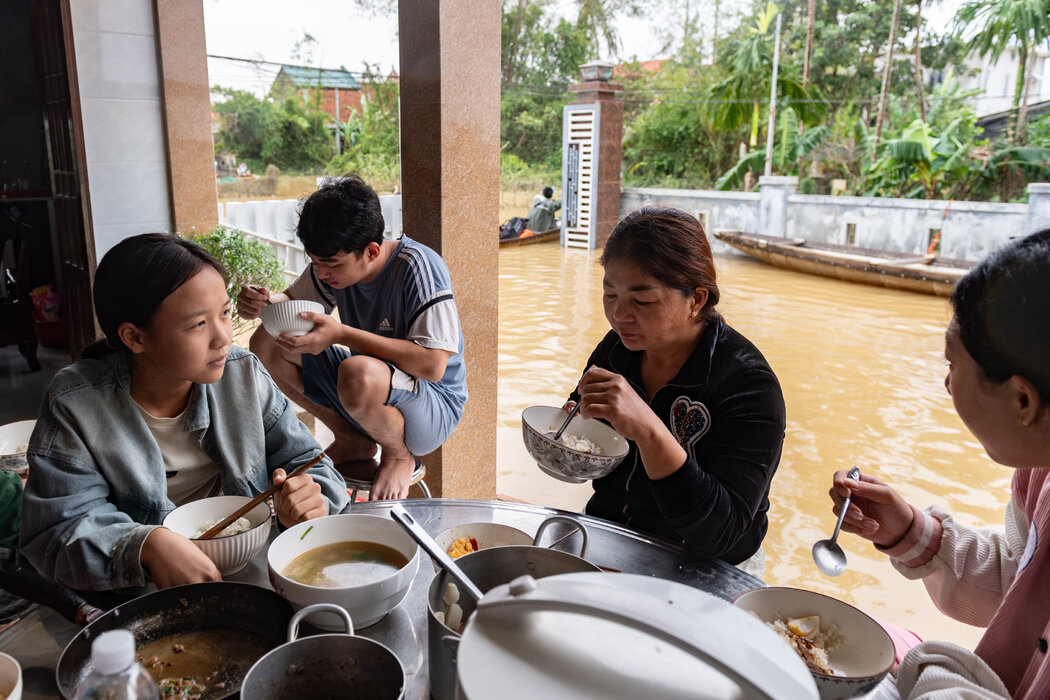 本月早些时候,越南顺化市翠山中村一户人家在受淹的家中吃午餐。 THANH HUE/GETTY IMAGES