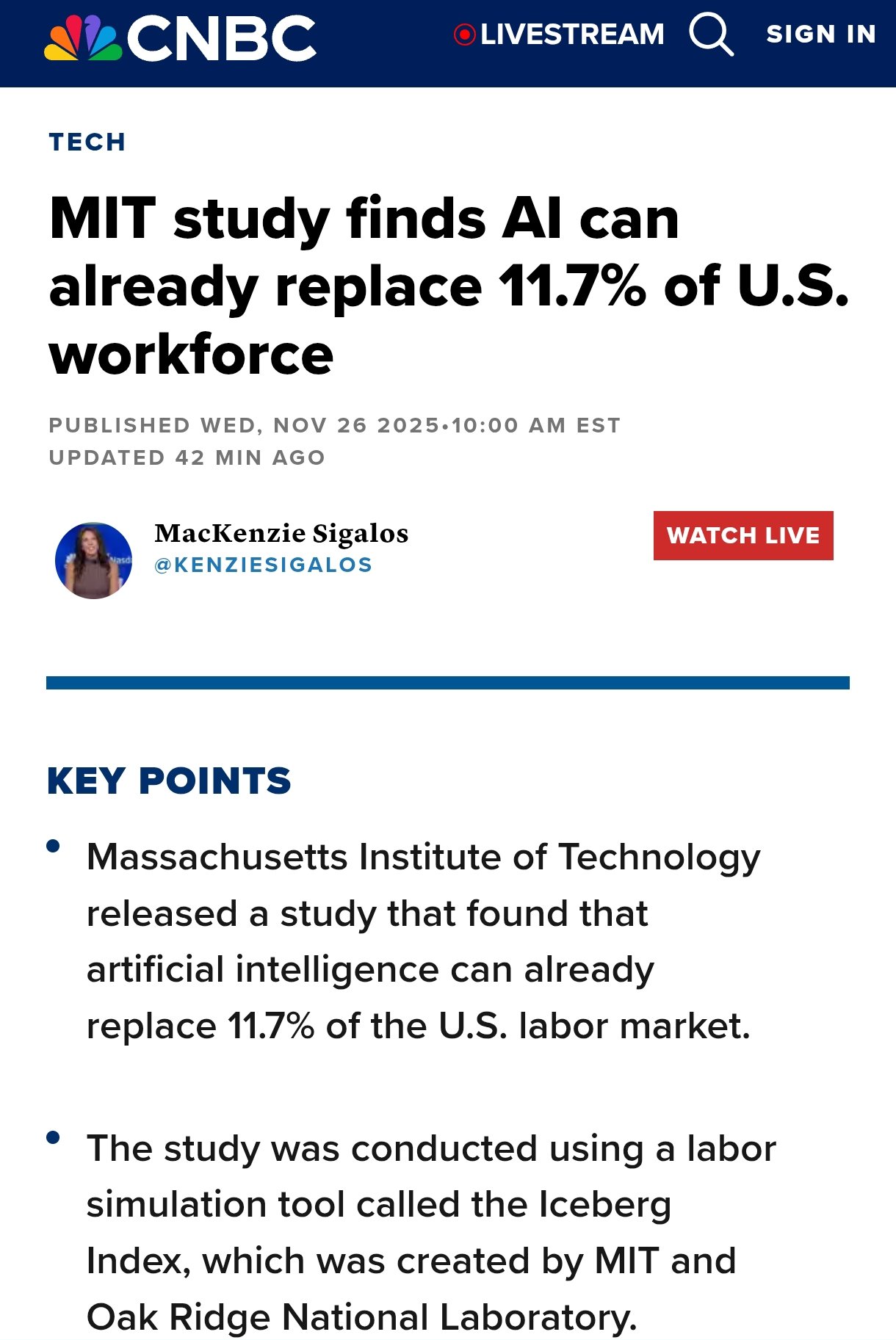 这项研究基于一种名为“冰山指数”(Iceberg Index)的劳动模拟工具。该工具由MIT与橡树岭国家实验室(ORNL)联合开发,旨在模拟全美1.51亿工人的互动模式,并评估他们如何受到AI技术普及及相关政策的影响。