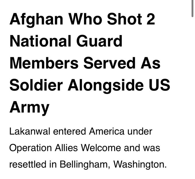 BREAKING - The National Guard shooter has been identified as Rahmanullah Lakanwal, an Afghan illegal who entered the United States under the Biden administration in 2021 and reportedly yelled “Allahu Akbar” during the attack. pic.twitter.com/h3KklqepoQ