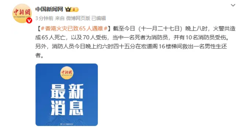 据中国新闻网消息,截至今日(十一月二十七日)晚上八时,火警共造成65人死亡,以及70人受伤,当中一名死者为消防员,并有10名消防员受伤。
