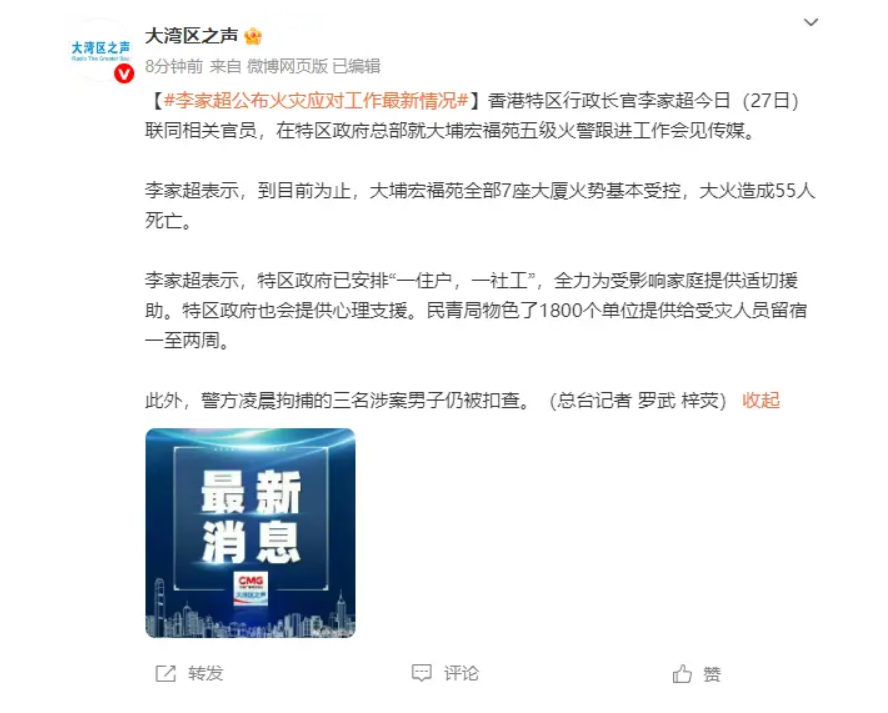 另据央视新闻,李家超宣布,今晚即时向灾民派发每户1万港元应急补助金,投入3亿港元成立大埔宏福苑援助基金。