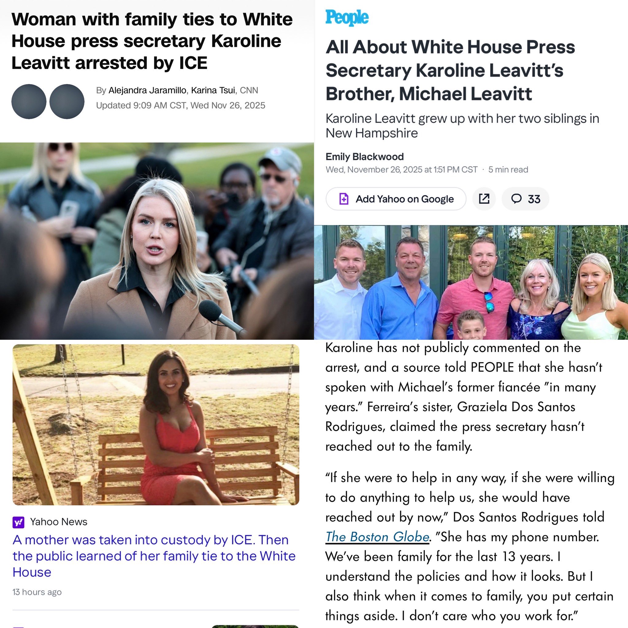 这起事件极具讽刺意味,卡洛琳·李威特身为川普遣返政策最坚定的捍卫者之一,如今却面临自己的「前大嫂」、自己亲姪子的母亲,成为这场扫荡行动下的牺牲品。