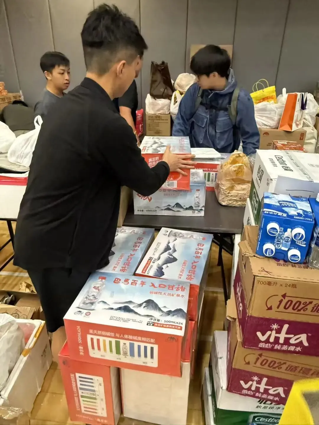 康体大楼被用作物资集散中心。兰雅薇拍下的视频里,志愿者们聚集在门外搬运物资。她看到,来自各处的物资被分门别类地储存在各楼层,之后再由各组义工分发至各个急救点。体育馆周围停放着装载充电宝等物资的车辆。