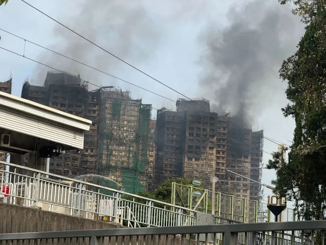 11月27日下午5时左右,从大埔墟地铁站B出口就可以看到宏福苑失火楼栋冒着烟,靠近地铁站那侧的部分楼栋仍有火光。能观察到的着火点有两处,一处在高层,一处在较低层,火从烧烂的窗户往外冒。