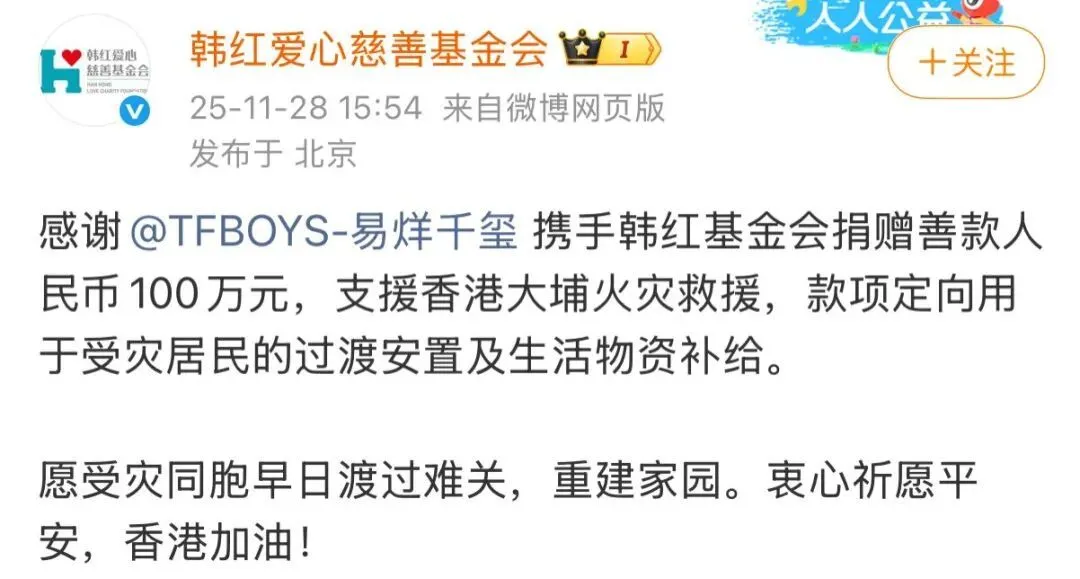 11月28日15时54分,韩红爱心慈善基金会发文,感谢易烊千玺捐赠善款100万元,支援香港大埔火灾救援。