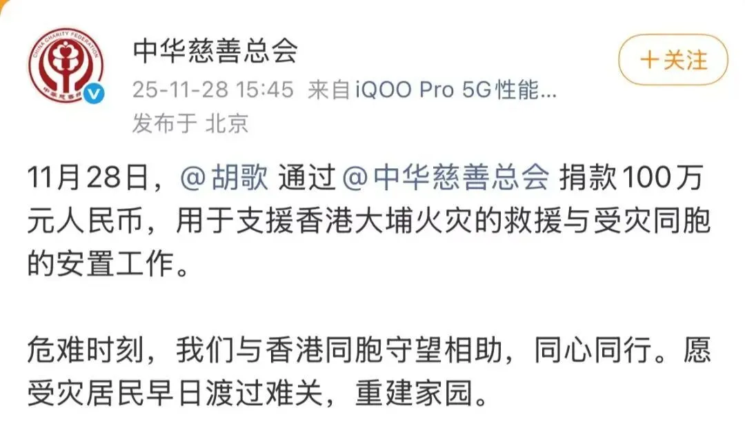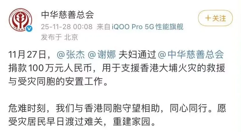 而杨紫的捐赠是通过个人账号完成,并备注了“香港大埔火灾救助+杨紫”。中华社会救助基金会表示,这笔捐赠将定向用于援助受灾香港同胞的安置保障和灾后家园重建工作。