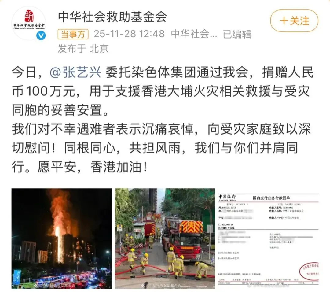 该账号分享的图片显示,张艺兴系委托染色体娱乐集团,通过中华社会救助基金会捐赠人民币(专题)100万元,用于支援香港大埔火灾相关救援与受灾同胞的妥善安置,付款回单里备注了“香港大埔火灾救助-张艺兴”。
